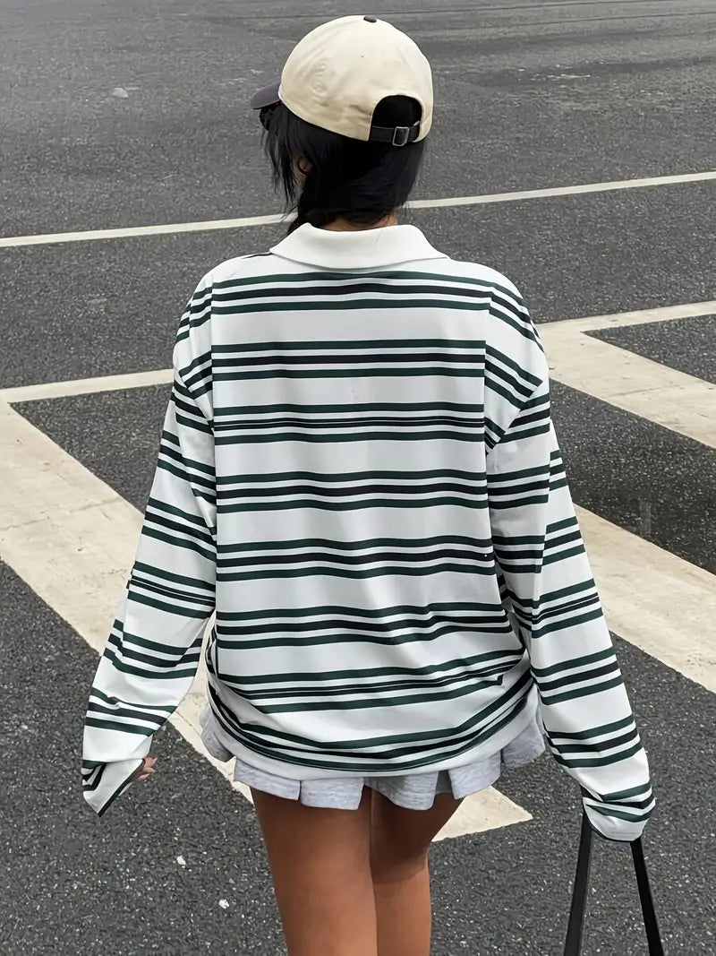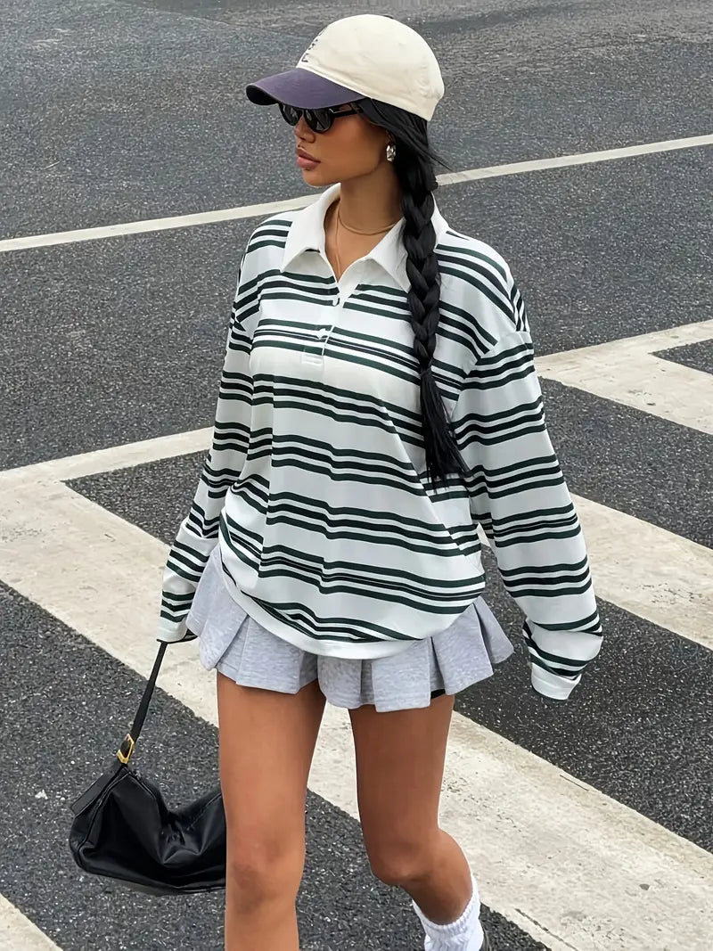 Locker geschnittenes Damen-Poloshirt mit langen Ärmeln und modernem Streifenmuster. Der oversized Fit sorgt für einen trendigen, lässigen Look, während das weiche Material angenehmen Tragekomfort bietet. Ideal für Streetwear-Styles, Freizeit und sportlich-elegante Outfits.