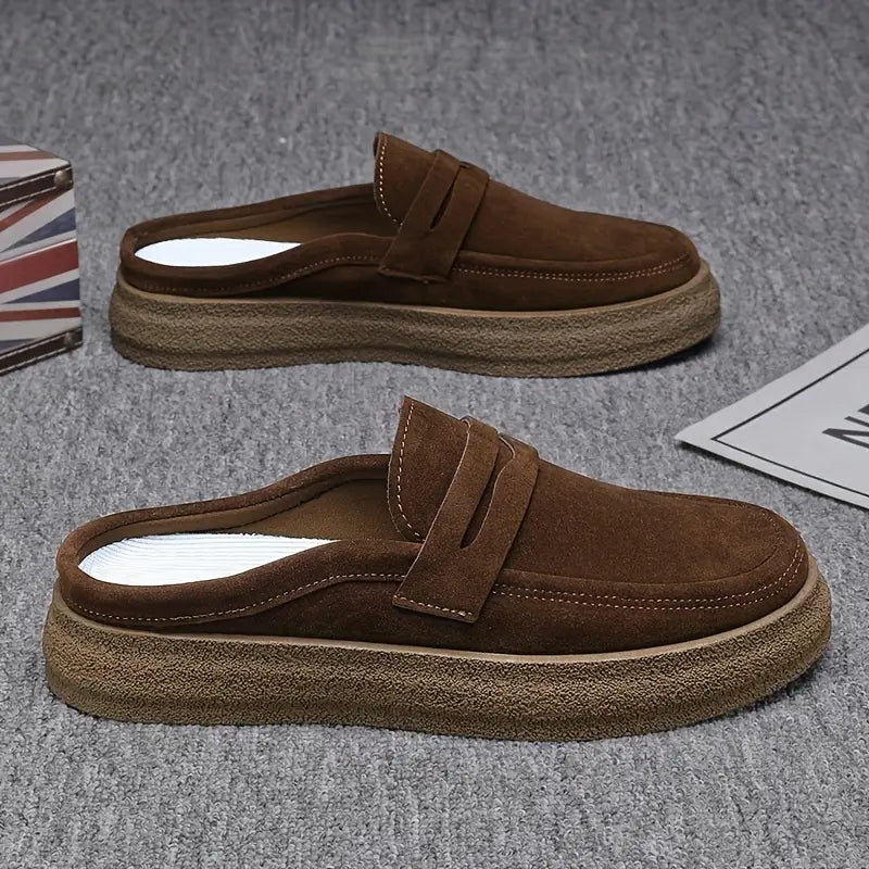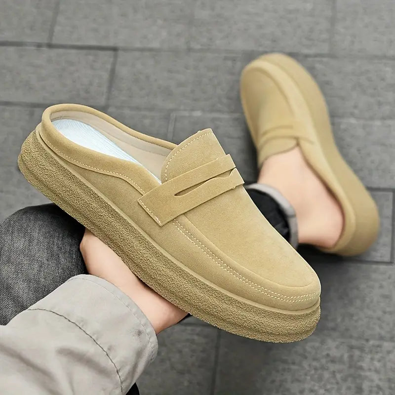 Moderner Herren-Loafer im Mule-Design mit robuster Plateausohle. Das hochwertige Wildleder sorgt für einen eleganten Look, während die offene Ferse und die bequeme Passform idealen Tragekomfort bieten. Perfekt für Freizeit, urbane Outfits und stilvolle Sommer-Looks.