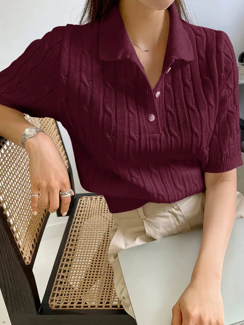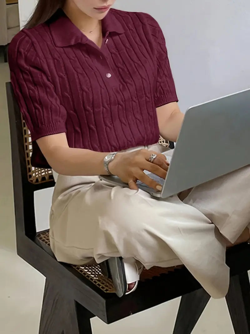 Elegantes Damen-Poloshirt aus Feinstrick mit klassischem Zopfmuster. Das weiche, elastische Material sorgt für hohen Tragekomfort und eine feminine Silhouette. Mit Polokragen, kurzer Knopfleiste und halblangen Ärmeln – ideal für Büro, Freizeit und elegante Alltagslooks.