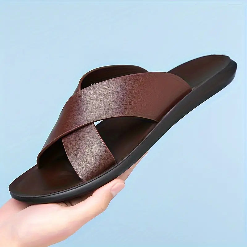 Herren-Hausschuhe mit offener Zehenpartie und gekreuzten Riemen in Volltonfarbe, atmungsaktiv, bequem, rutschfest.