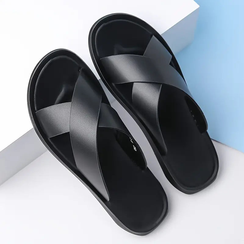 Stylische Herren-Sandale mit überkreuzten Riemen. Das minimalistische Design kombiniert modernen Look mit hohem Tragekomfort. Die leichte, rutschfeste Sohle sorgt für Stabilität – perfekt für Freizeit, Urlaub und warme Tage.